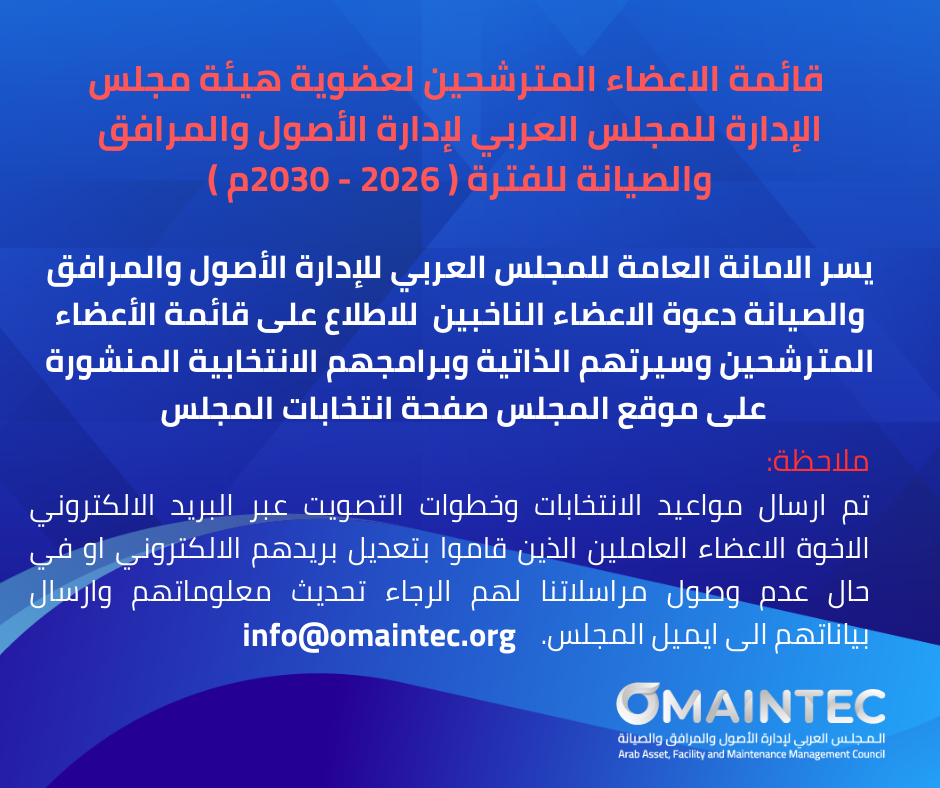 ان تكون الجهة المتقدمة لطلب العضوية احدى الهيئات المهنية والمنظمات والشركات التي تعمل في مجال التشغيل والصيانة وإدارة المرافق والأصول وتضم عدد كبير من العاملين في هذا المجال في إحدى الدول العربية سواء كانت تابعة للقطاع العام أو القطاع الخاص.