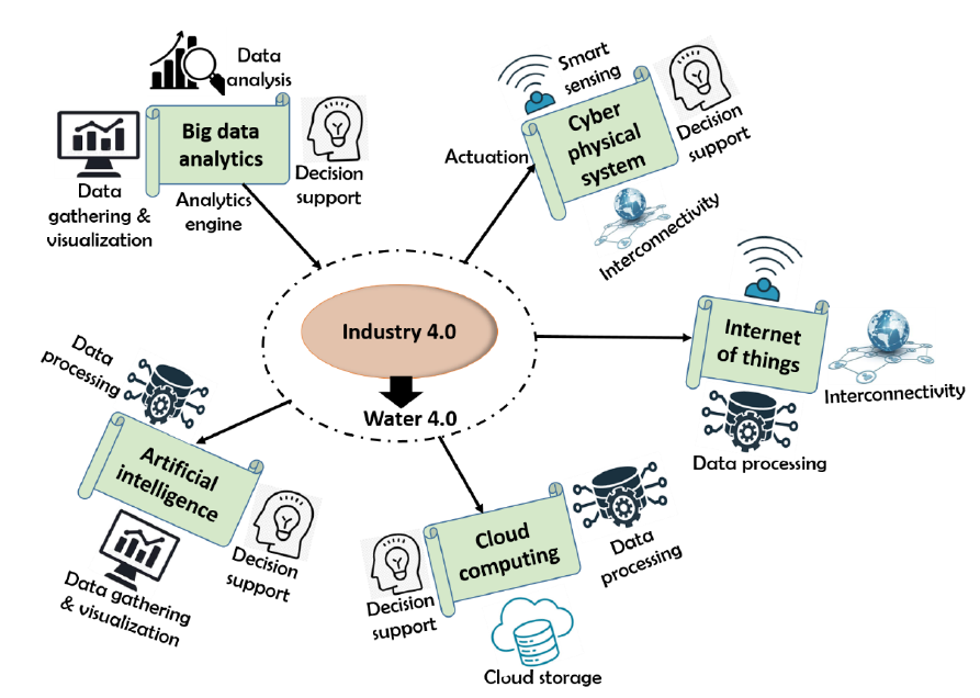 It incorporates the primary features of (Industry 4.0) such as digitization and automation to achieve a systemic water management context. Through the use of automation and increased integration of sensors (for pressure, flow, and temperature measurement) and model applications such as (the hydrolic model of water networks), opportunity may be created to better understanding water management problems in terms of their complexity and to illustrate the use of water 4.0 in production, early warning and for the decision making process.
