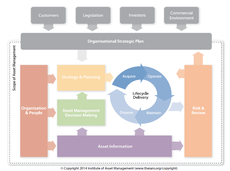 Figure 1: Asset lifecycle representation in relationship with other business dimensions (The institute of Asset Management, 2016)