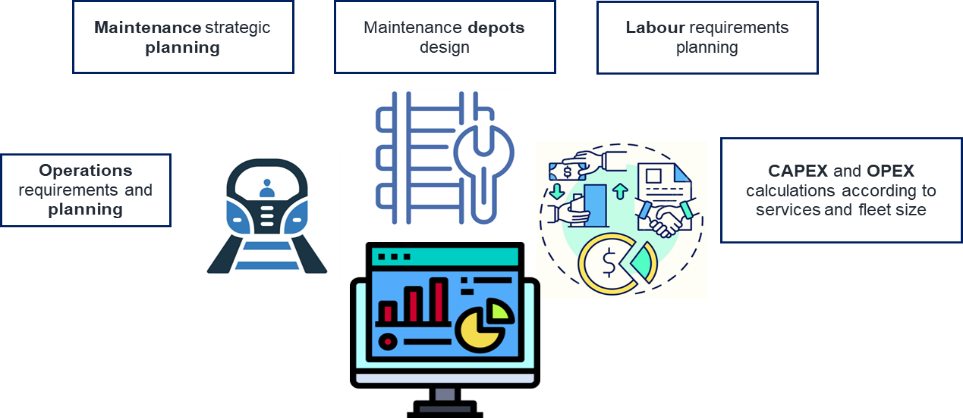 In this section we present a novel tool to support decision-making in the planning and acquisition phase of assets lifecycle. It could be either applied to portfolios of assets, infrastructure, or fleets of transportation assets. In the present case, we apply the solution to a fleet of trains together with the Spanish rolling stock OEM Talgo. We apply the tool to this case as a proof of concept because determining the operation and maintenance conditions of moving assets is more challenging to parameterize and calculate. The tool combines multiple dimensions that constitute the correct quantification of the assets needed, and their subsequent maintenance service, to fulfil certain operational requirements, and with certain maintenance resources limitations. In Figure 2 the solution can be observed, as a modular combination of diverse aspects.